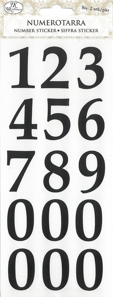 Katso kaikki tiedotNumerotarrat askarteluun ja koristeluun. Pakkaus sisältää kaksi arkkia, jossa on muoviset numerotarrat 0-9. Yhden numeron korkeus on n. 3,6cm.